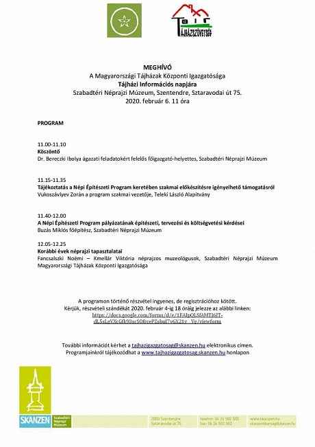 A Magyarországi Tájházak Központi Igazgatósága 2020. február 6-án Tájházi információs napot rendezett a Népi Építészeti Program szakmai előkészítésére kiírt támogatásról. Az Információs elhangzott előadások diái a jobb oldali Témához ajánljuk fülön keresztül érhetők el.