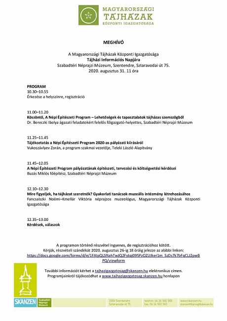A Magyarországi Tájházak Központi Igazgatósága 2020. augusztus 31-én Tájházi Információs napot rendezett a Népi Építészeti Program kapcsán. Az információs napon elhangzott előadások a jobb oldali Témához ajánljuk fülön keresztül érhetők el.